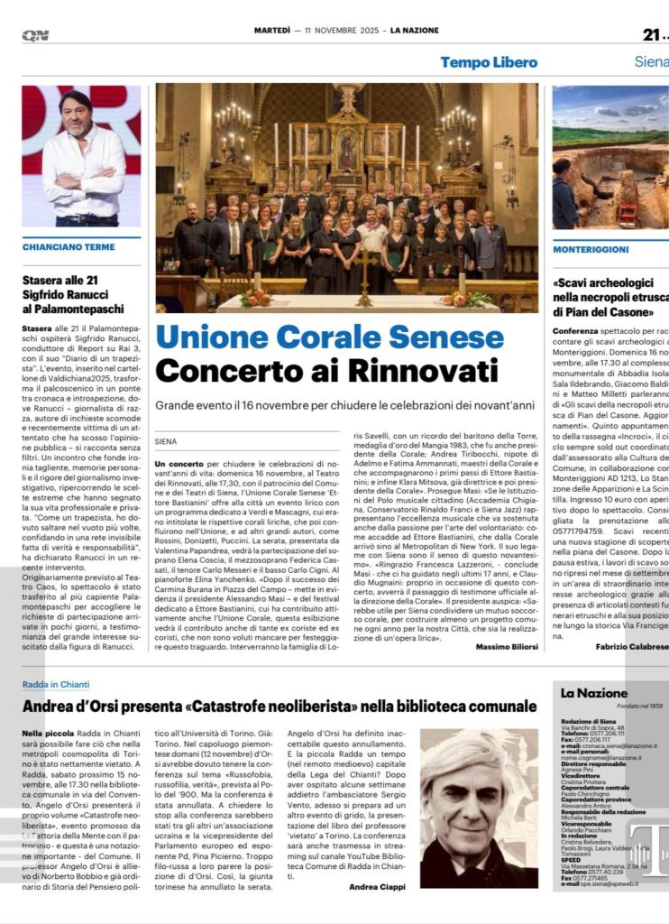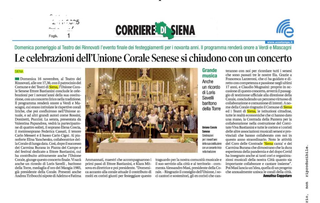 Continuando con i festeggiamenti per il 90° anniversario dell’Unione Corale Senese “Ettore Bastianini”, il 16 novembre 2025 alle 17.30 presso il teatro dei Rinnovati di Siena, si è tenuto un Concerto Lirico al quale, oltre all’unione Corale Senese, hanno presso parte ex coristi della corale e 4 solisti professionisti. Sono stati eseguiti per la maggior parte brani operistici di Verdi e Mascagni dato che l’Unione Corale Senese “Ettore Bastianini” è nata dalla fusione dalla Società Corale Giuseppe Verdi con la Società Corale Pietro Mascagni, avvenuta il 13 aprile del 1935.